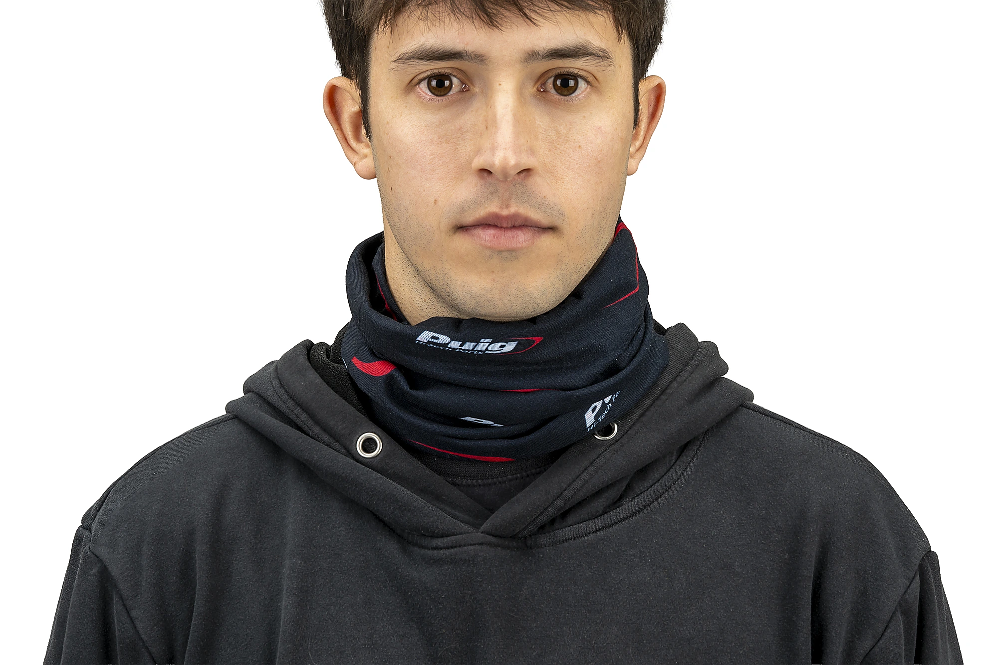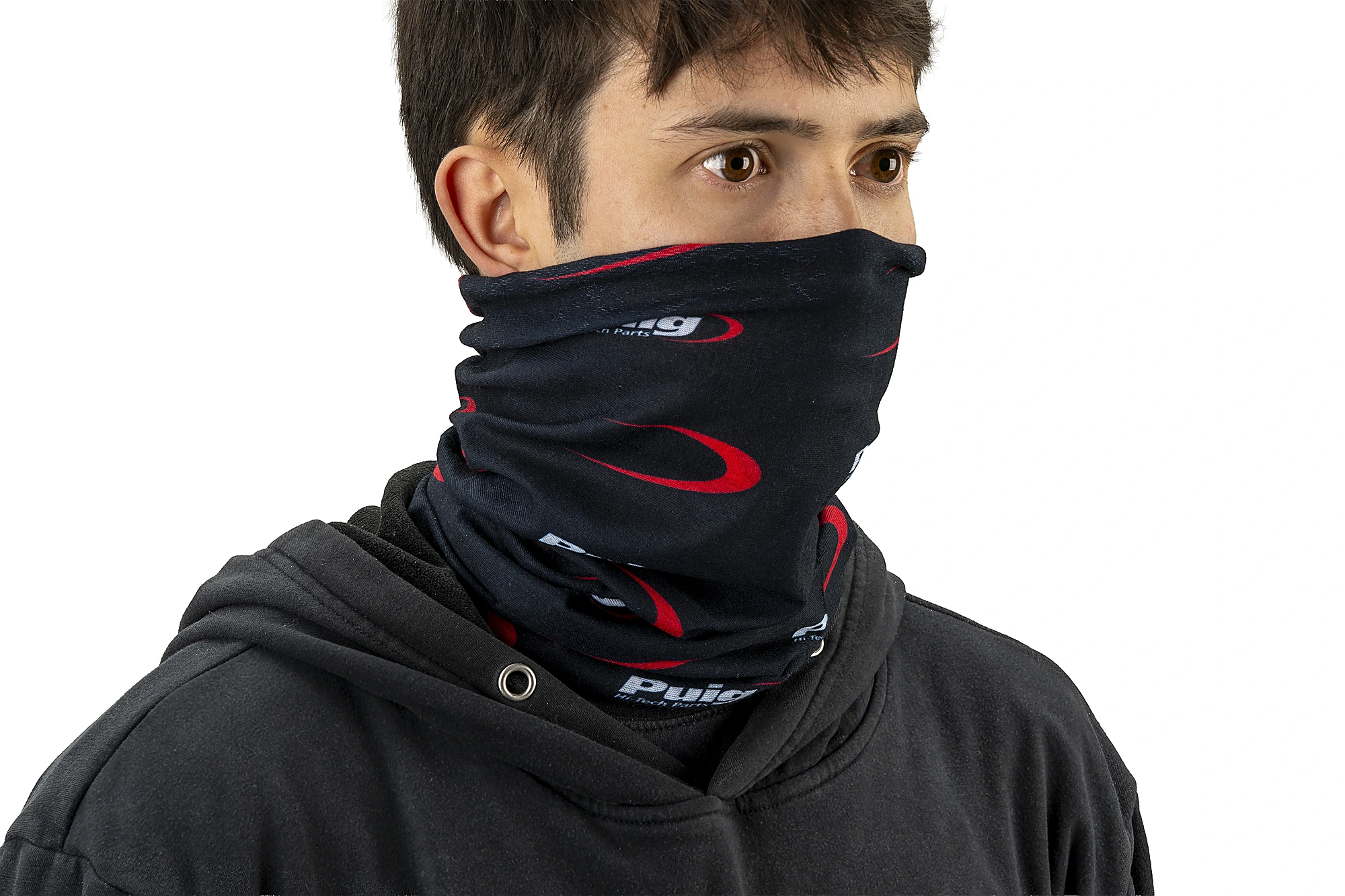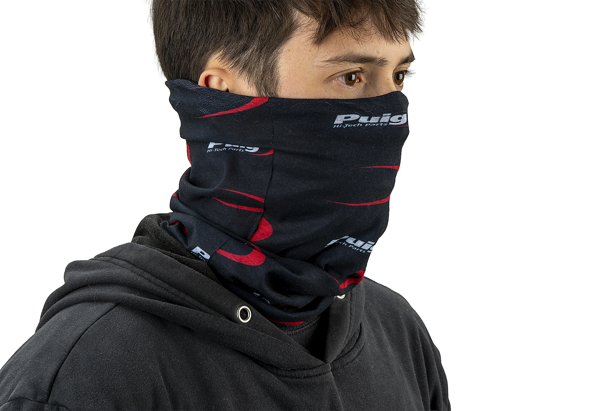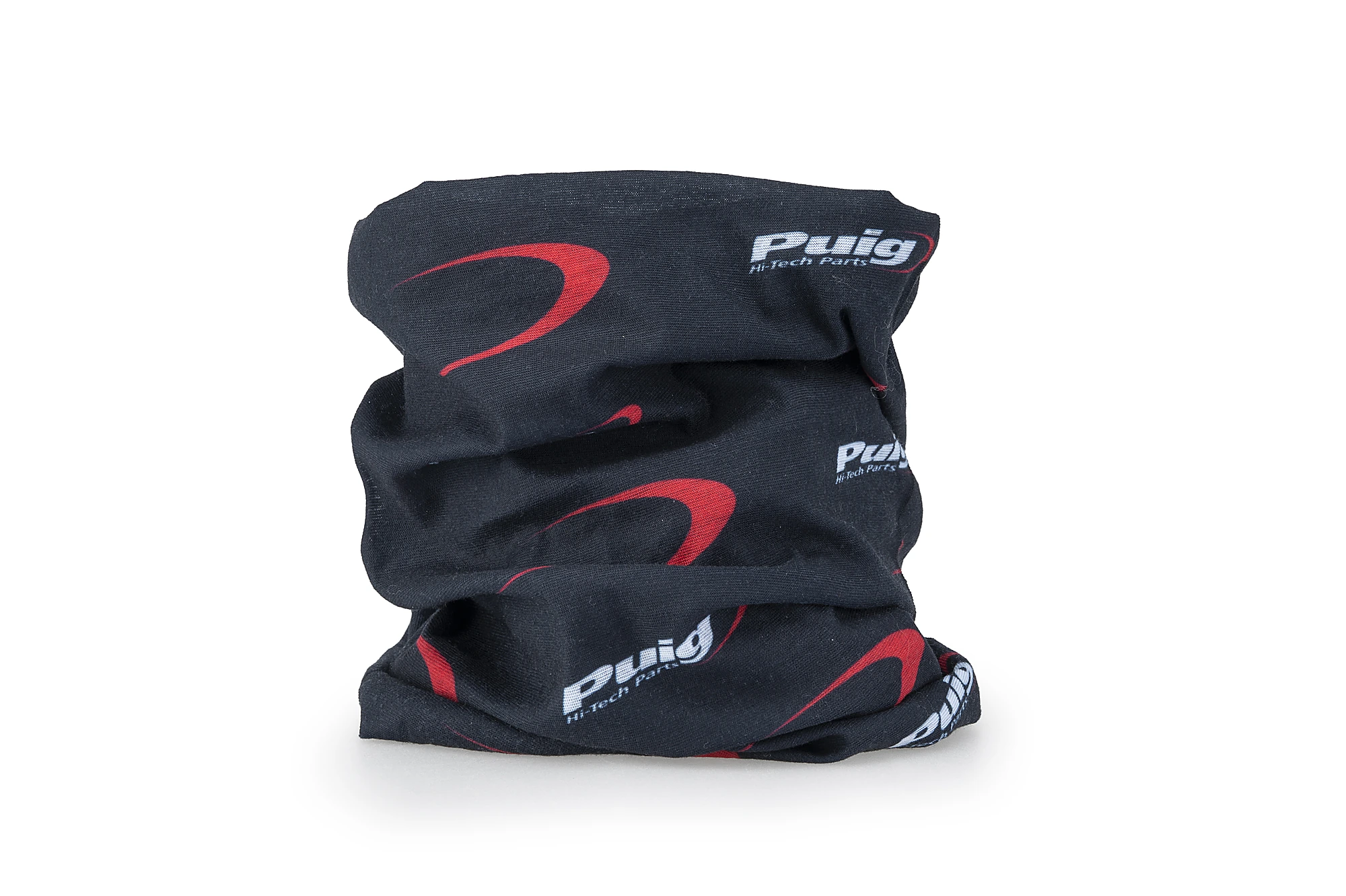 Le catalogue Puig dispose d'une ligne d'équipement pour le motard, composée de vêtements et accessoires tels que ce tour de cou, décoré du logo Puig Hi-Tech Parts.