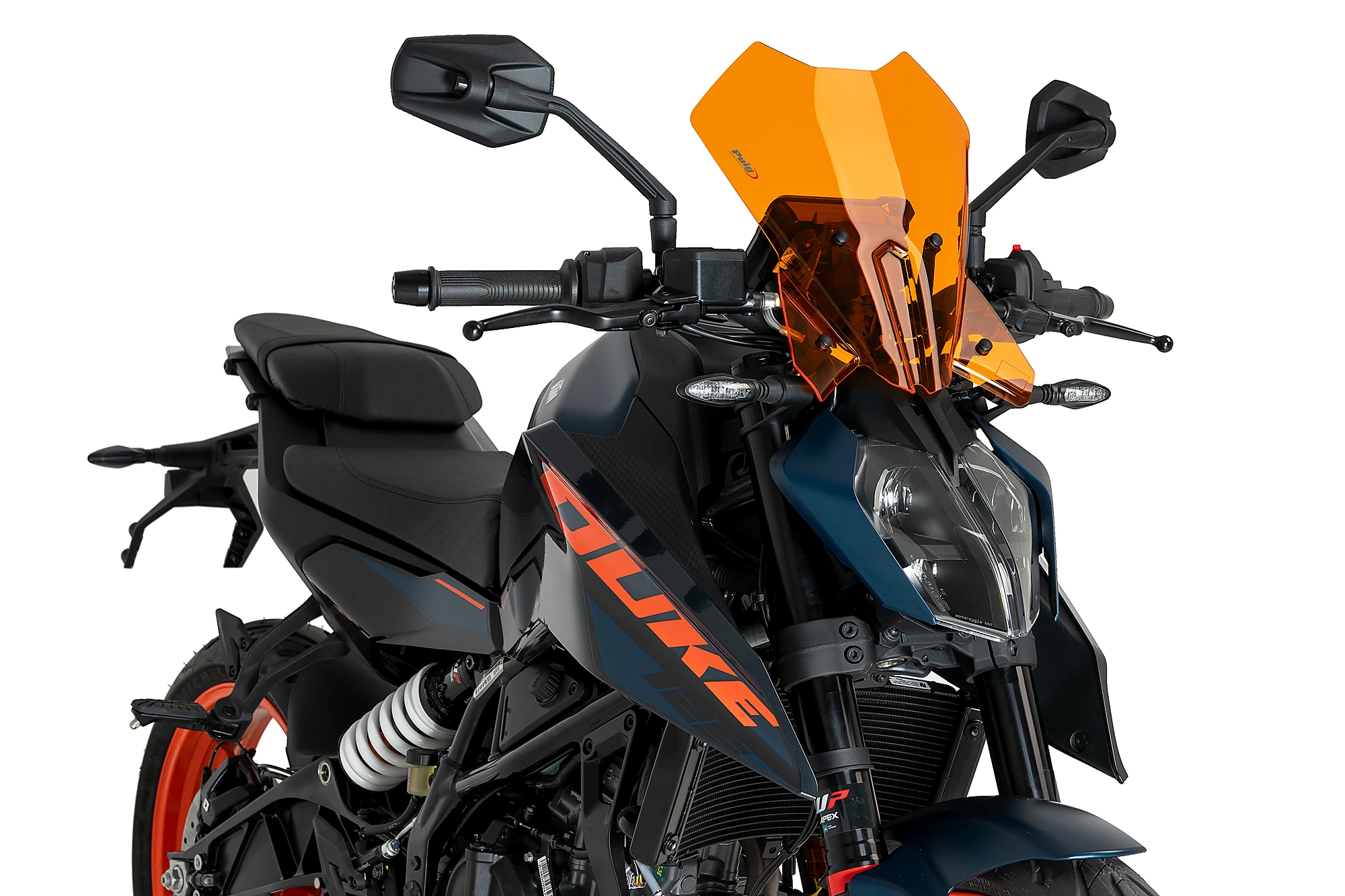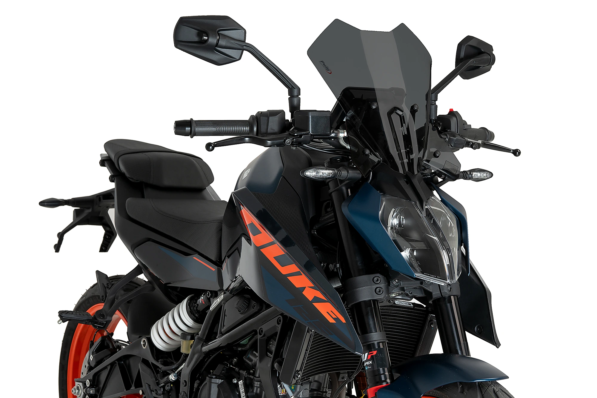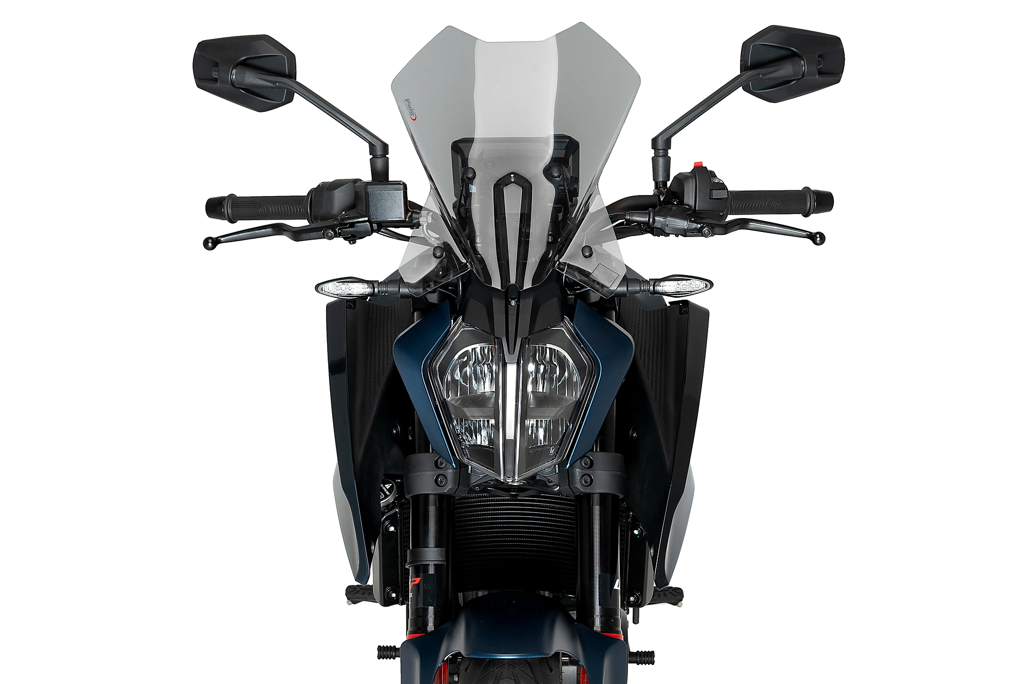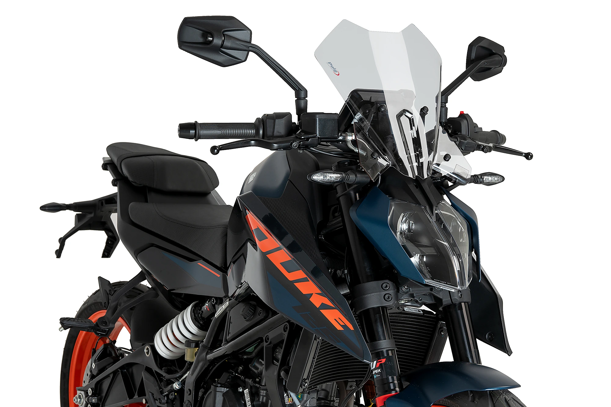 Rinnova l'immagine della KTM 1390 SUPER DUKE con un parabrezza Touring dalle linee molto curate, definito da due deflettori inferiori che si adattano perfettamente agli indicatori di direzione e al faro. Una figura centrale si estende dal faro al cruscotto, conferendo una personalità unica all'insieme moto-parabrezza. Progettato per i piloti che cercano una maggiore protezione aerodinamica, le sue forme sono state studiate in una galleria del vento virtuale. Questo design sportivo, elegante e altrettanto funzionale offre una protezione aggiuntiva sia per il pilota che per il frontale della moto. Sopportare meno pressione dell'aria durante la guida si traduce in maggiore comfort, meno affaticamento e meno stanchezza per il pilota.