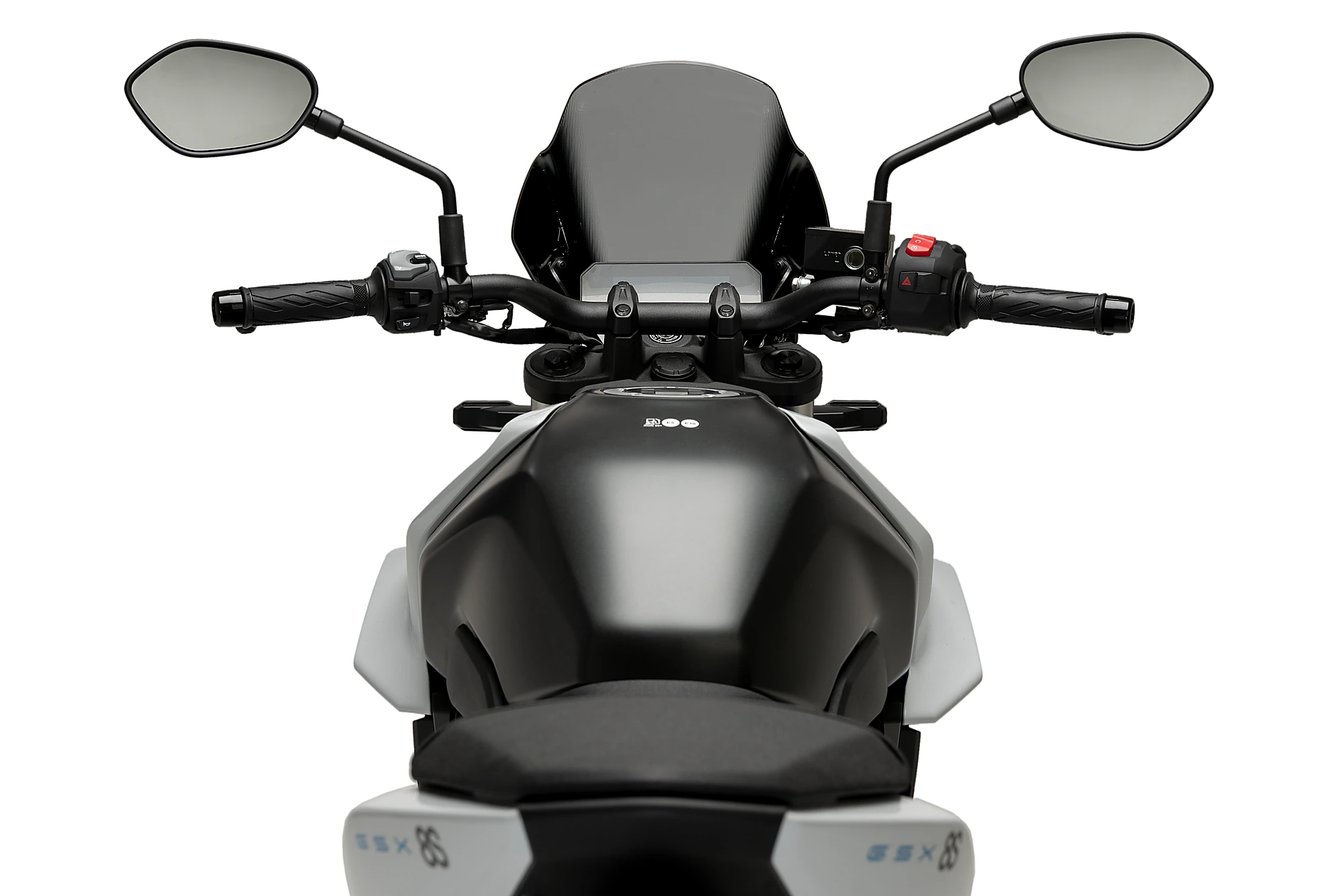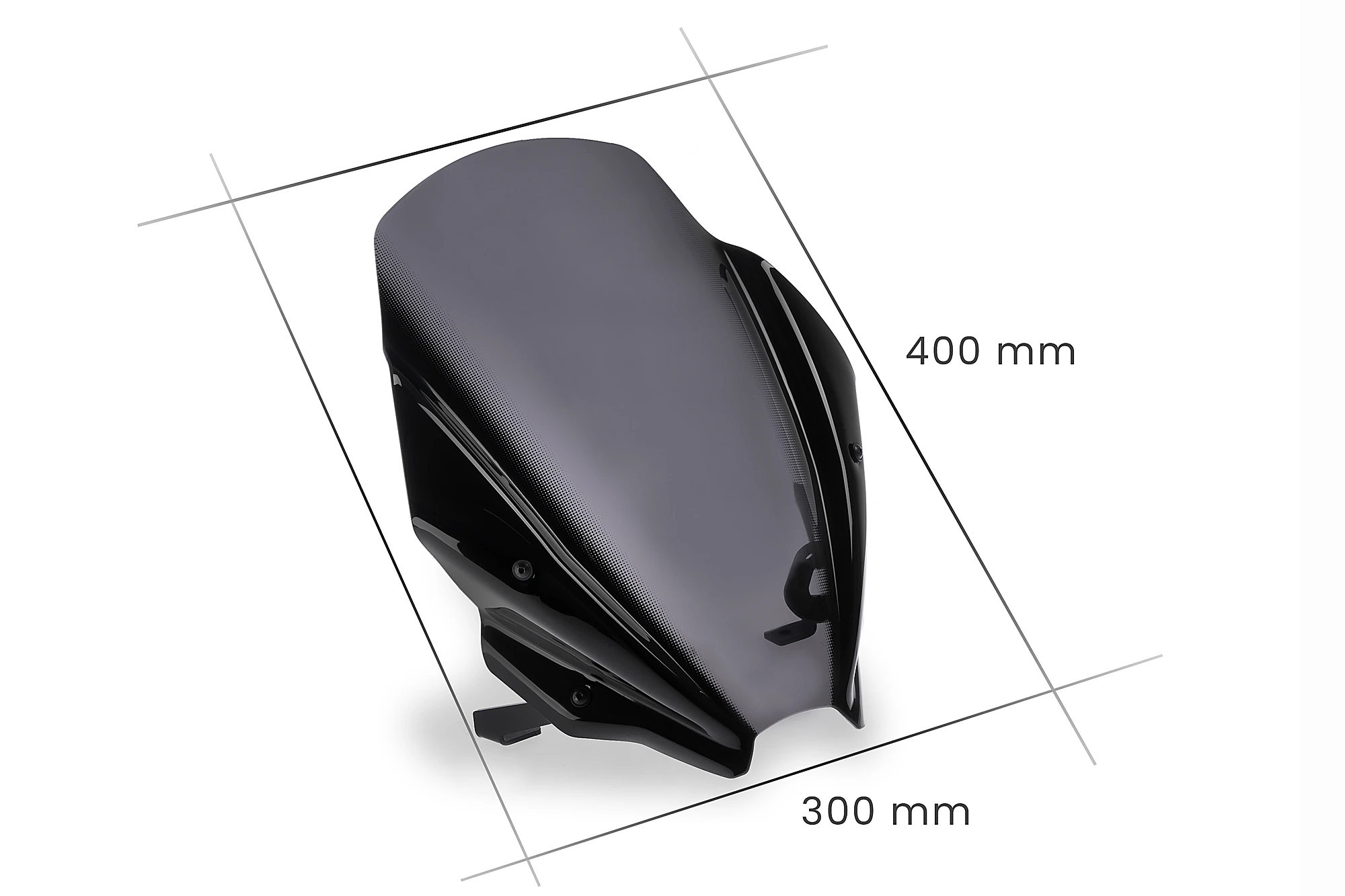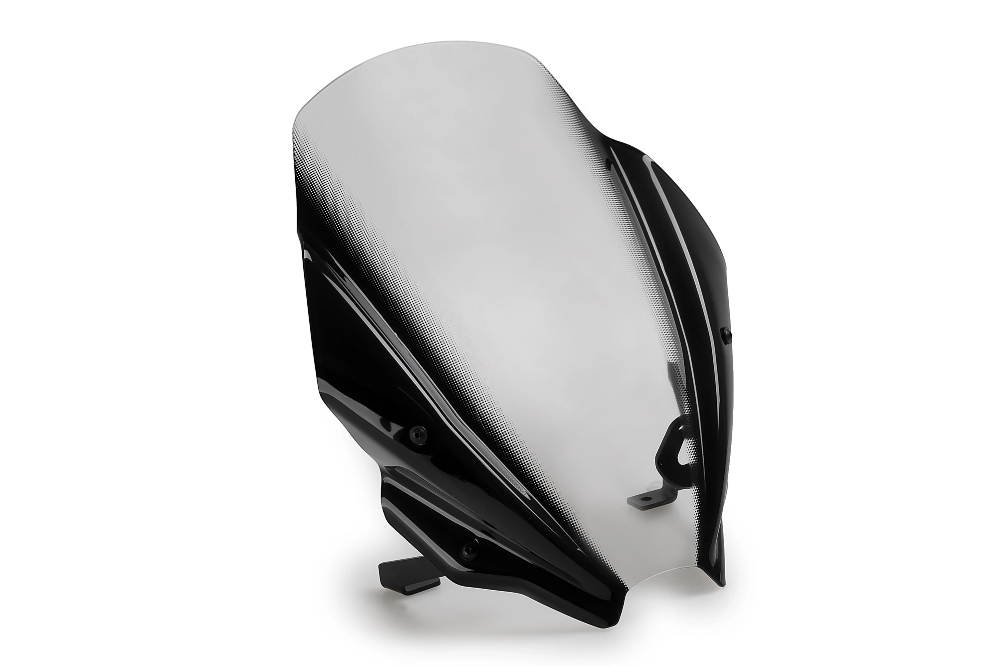 La sua superficie centrale si estende dal faro all'estremità del parabrezza, raggiungendo una perfetta egemonia con la parte anteriore della motocicletta. Le sporgenze laterali incorporano una serigrafia interna che le separa dalla zona centrale con lo scopo di ridurre il peso visivo del prodotto e nascondere i supporti.
