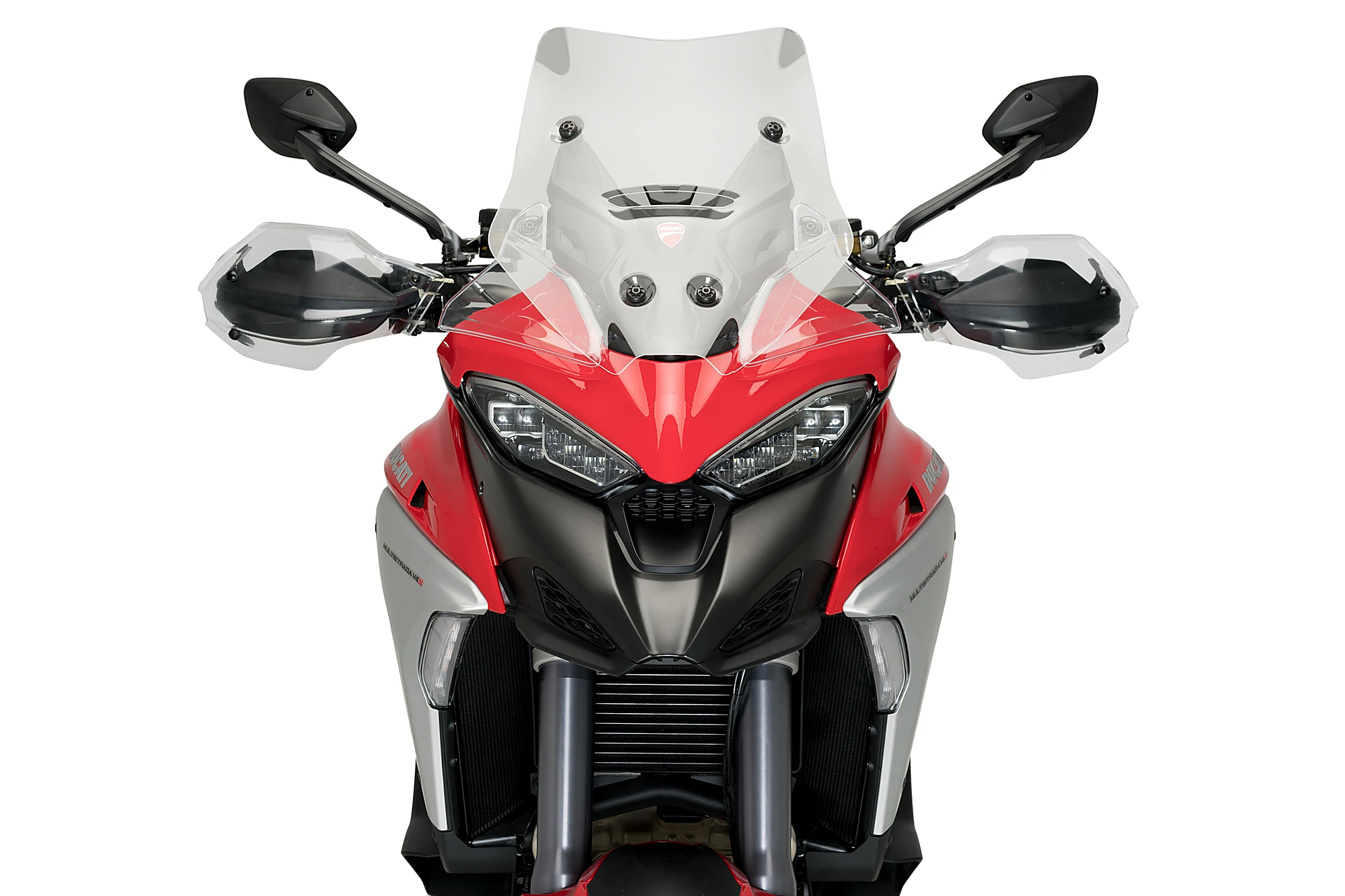 La nuova estensione paramano per la Ducati Multistrada V4 2021- mira ad aumentare la capacità aerodinamica della tua moto, fornendo così una maggiore protezione alla zona degli avambracci e alla parte bassa delle spalle del pilota. A sua volta, evitando l'ingresso di acqua nei guanti del motociclista ed evitando l'impatto di sassi o oggetti che troviamo durante il percorso.
