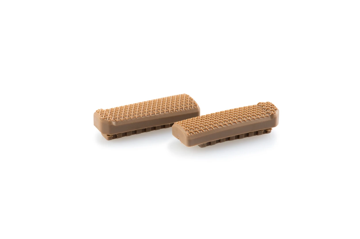 Questi poggiapiedi sono fabbricati a partire da un blocco di alluminio, su cui è realizzato un rivestimento anodizzato ed è montato un supporto in gomma per migliorare l'aderenza dello stivale e l'isolamento delle vibrazioni.